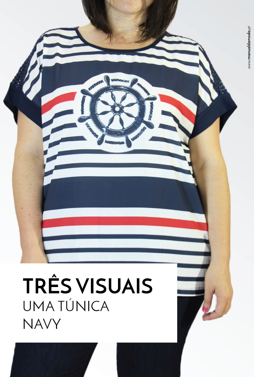 Três formas para usar uma túnica às riscas navy