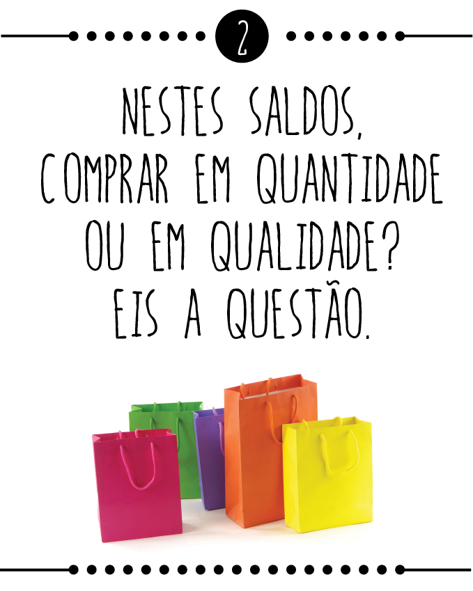 Os saldos podem ser uma verdadeira zona de guerra cheia de armadilhas e granadas prestes a explodir. Tanto podemos encontrar verdadeiros achados, como trazer uma peça estragada ou algo que, ainda pior, nunca usaremos. Encontramos as lojas num caos com filas enormes para os provadores e, se pelo meio conseguirmos escolher alguma coisa por sorte e pressão, ainda temos que esperar, exaustivamente, para pagar. Ao longo destas semanas partilhámos algumas dicas e sugestões, no entanto, hoje gostaríamos de saber qual será a vossa estratégia de sobrevivência e boas compras: a quantidade ou a qualidade?