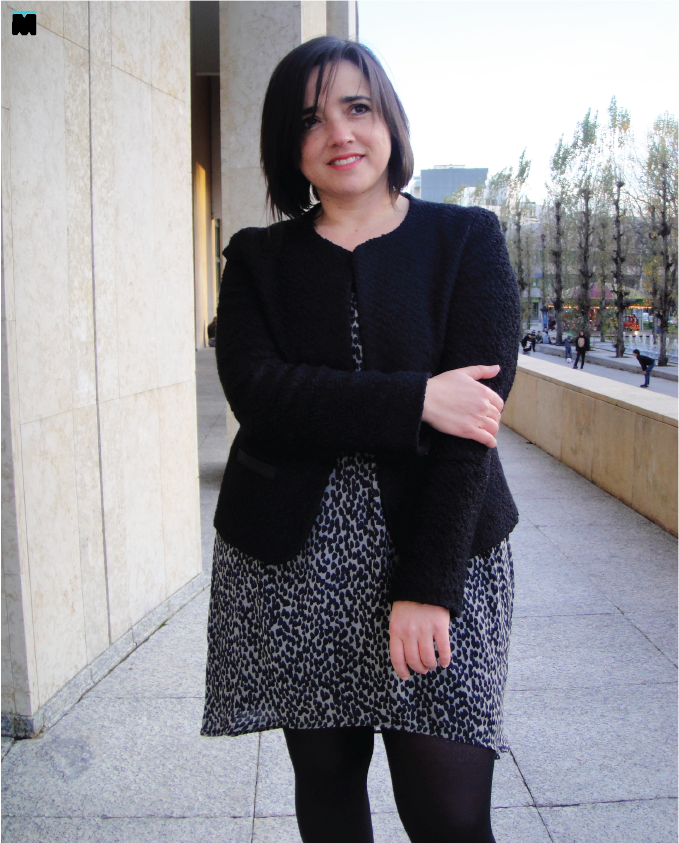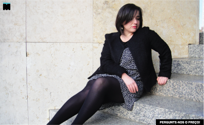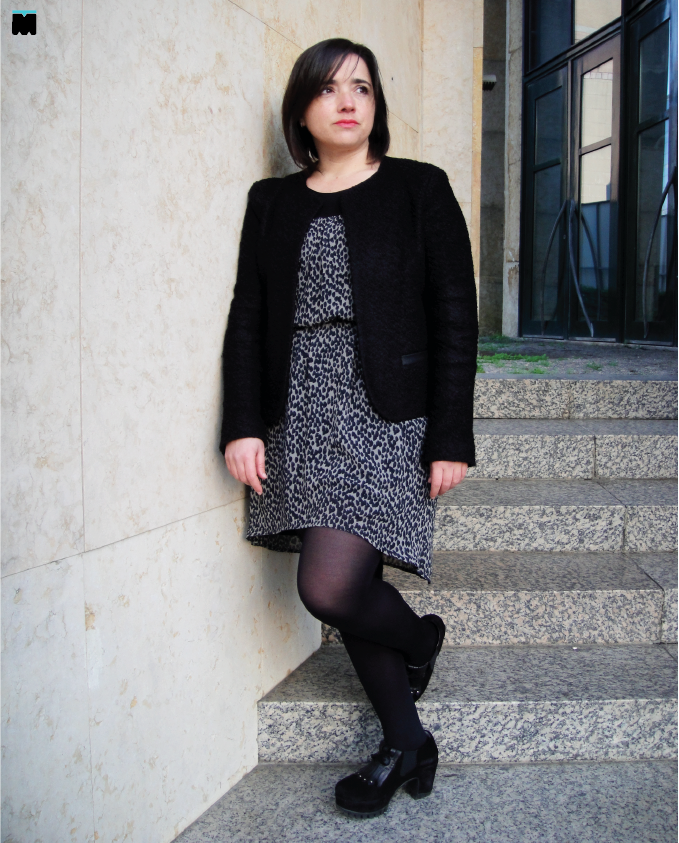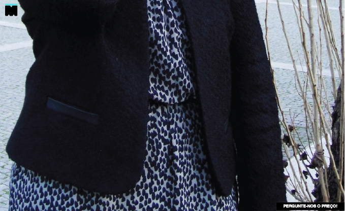 2. Os visuais monocromáticos alongam a silhueta e não precisam de ser enfadonhos. Pelo menos, não para mim. Neste conjunto uso, apenas, duas cores, mas como recorri a um padrão o conjunto deixa de ser estático. Criei a ilusão de elegância assumindo a cor mais escura do vestido nos restantes materiais. Tomem nota, meninas! É importante que os sapatos sejam da cor das meias. Até podem dizer que não se usa, mas funciona!