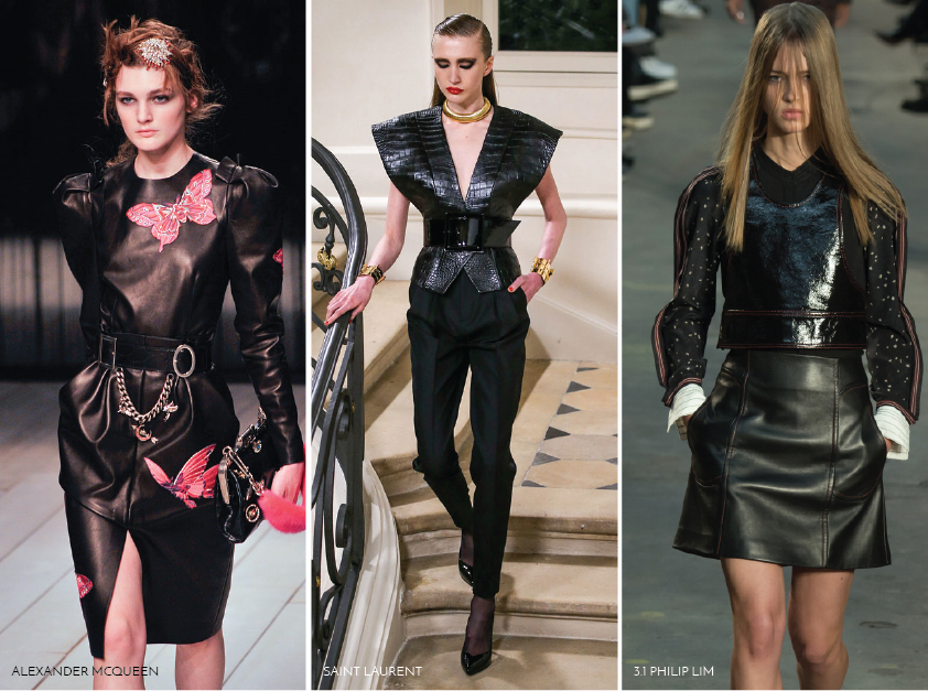 Esta semana falamos dos materiais que serão tendência esta estação e falar de materiais sem falar na pele (ou polipele), é como comer um decadente bolo de chocolate, sem chocolate. Não faria sentido! A pele é, sem dúvida, o material de desejo da mulher, seja o ano que for. Ano não. Década! É incontornável, de tal forma, que já não se usa só nos acessórios ou casacos. É vê-la na forma de tops, camisas, vestidos, saias e calças. Ai, as calças… É cada look de suspirar, não é? O problema é que os suspiros transformam-se em suores frios na hora de pensar em usá-las e exibir toda a nossa anca e celulite para quem quiser ver. Verdade?