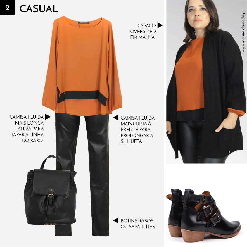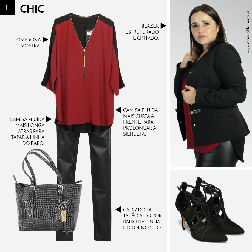 Se tem intenções de levar as calças de pele para o trabalho, esta sugestão é perfeita, desde que, o dress code assim o permita. Opte por uma camisa fluída mais curta à frente, para alongar o tronco, e mais comprida atrás, para tapar o rabiote e a celulite que teima em ser o centro das atenções. Esta camisa, por exemplo, disponível até ao tamanho 48, dispensa demasiados acessórios, porque tem uma aplicação dourada ao peito e ombros à mostra, que continua a ser tendência este Outono. Por fim, não se esqueça da terceira peça! A terceira peça é perfeita para tornar a silhueta mais elegante. Neste caso, o estilo pede algo mais estruturado e cintado como um blazer. Veja este look vestido aqui!