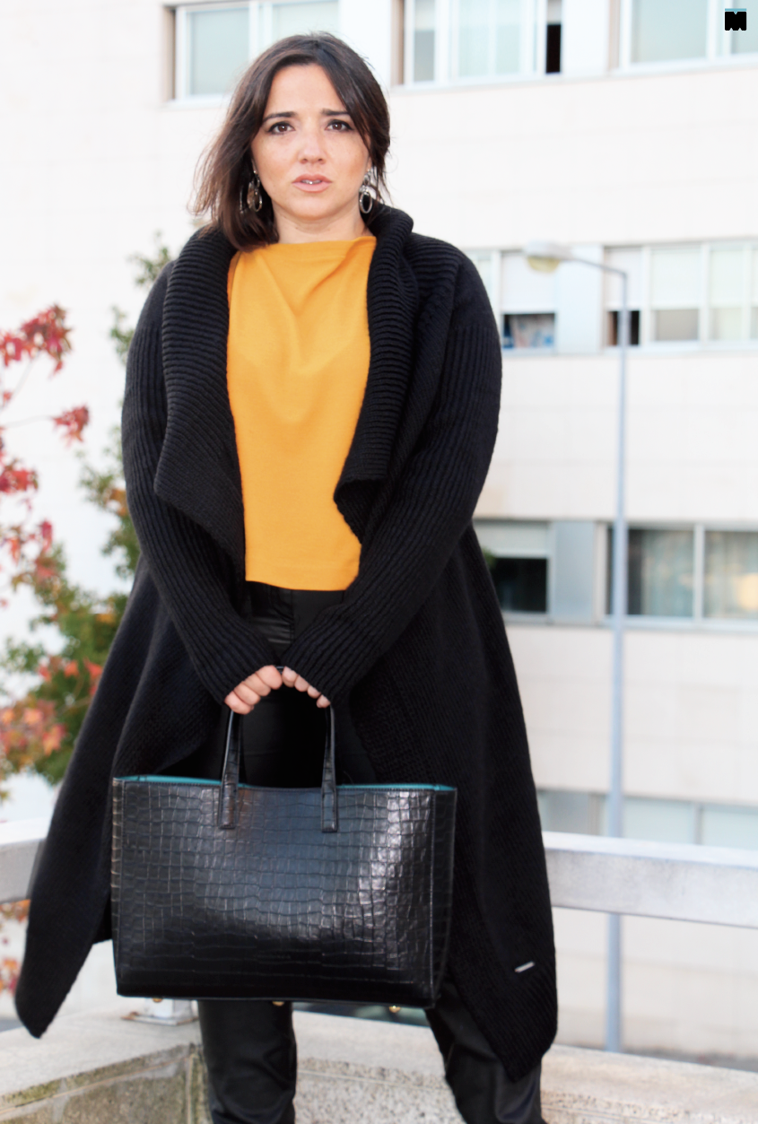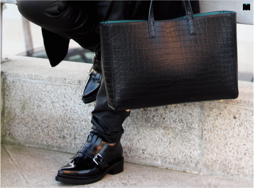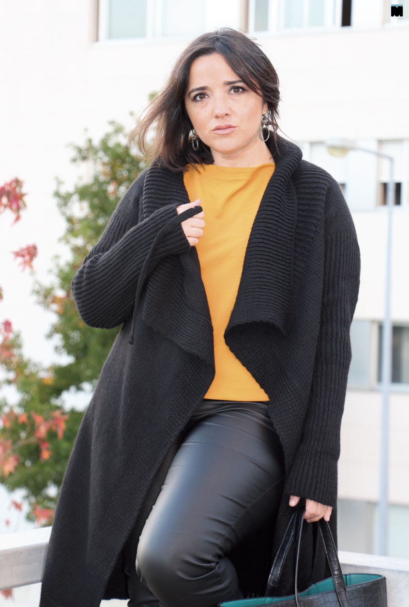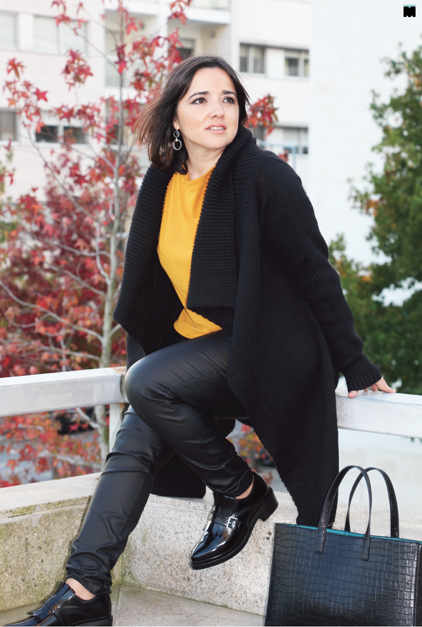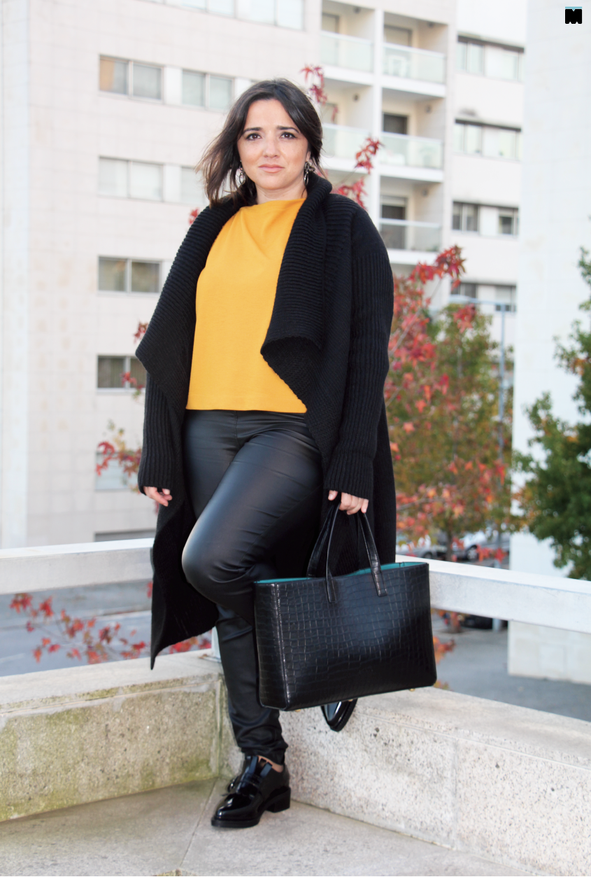 4. Tornar o visual mais interessante, misturando texturas como imitação de pele, malha e sapatos em verniz (sempre na mesma cor das calças para prolongar as pernas o máximo possível!).