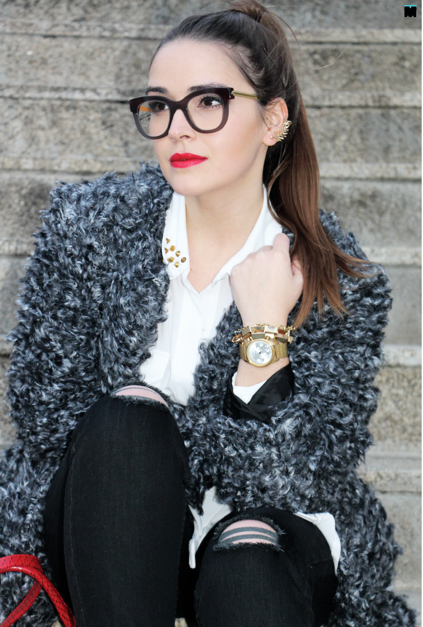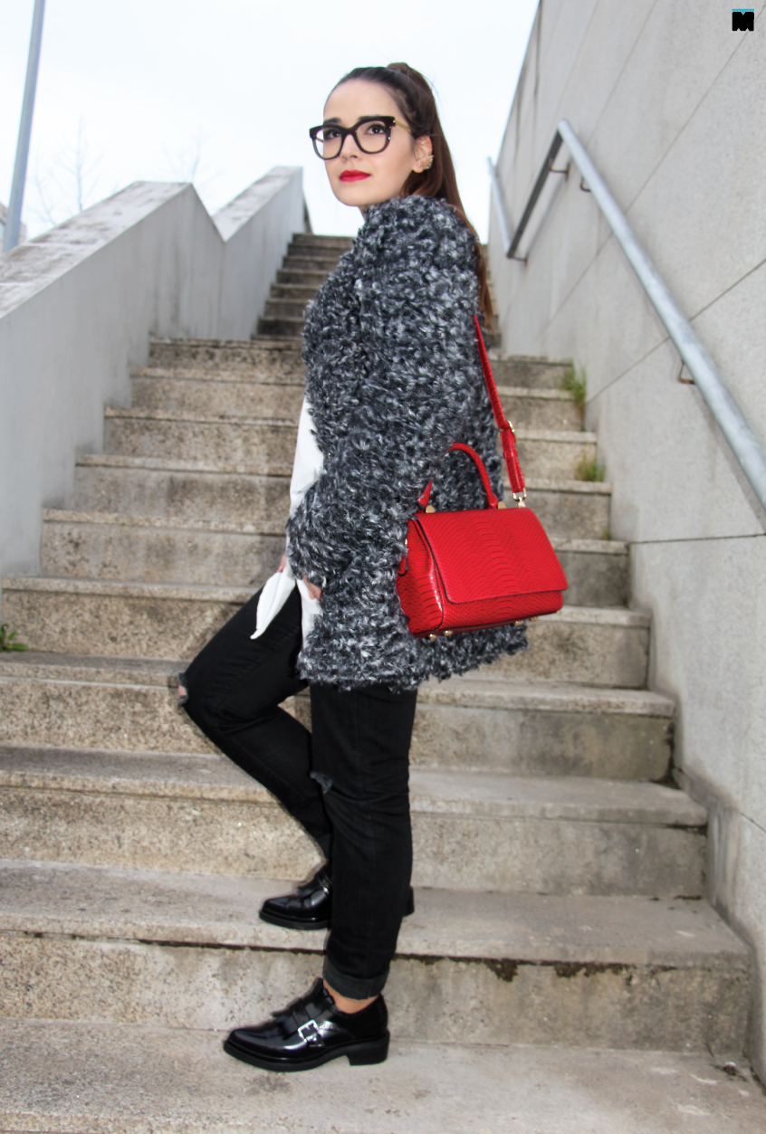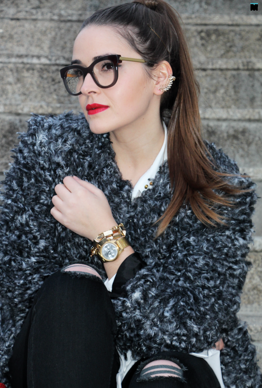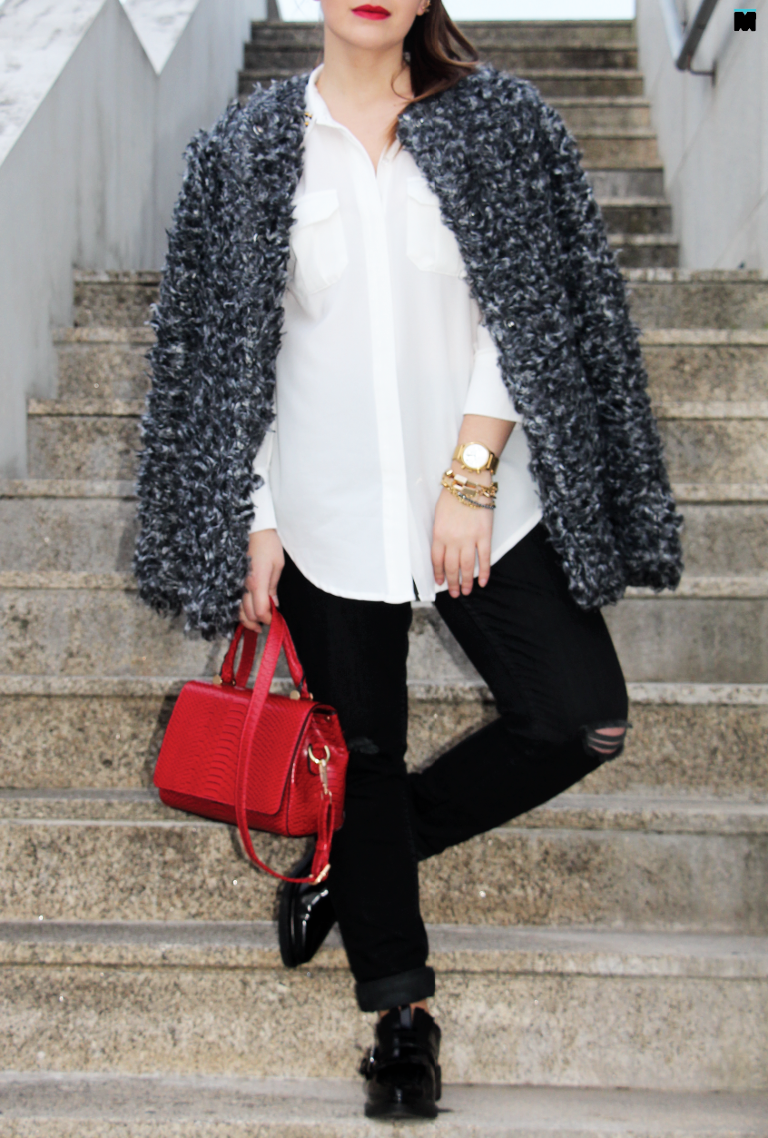 1. Acrescentar uma terceira peça que desse dinamismo ao visual, como este casaco em lã (que parece pêlo) maravilhoso;