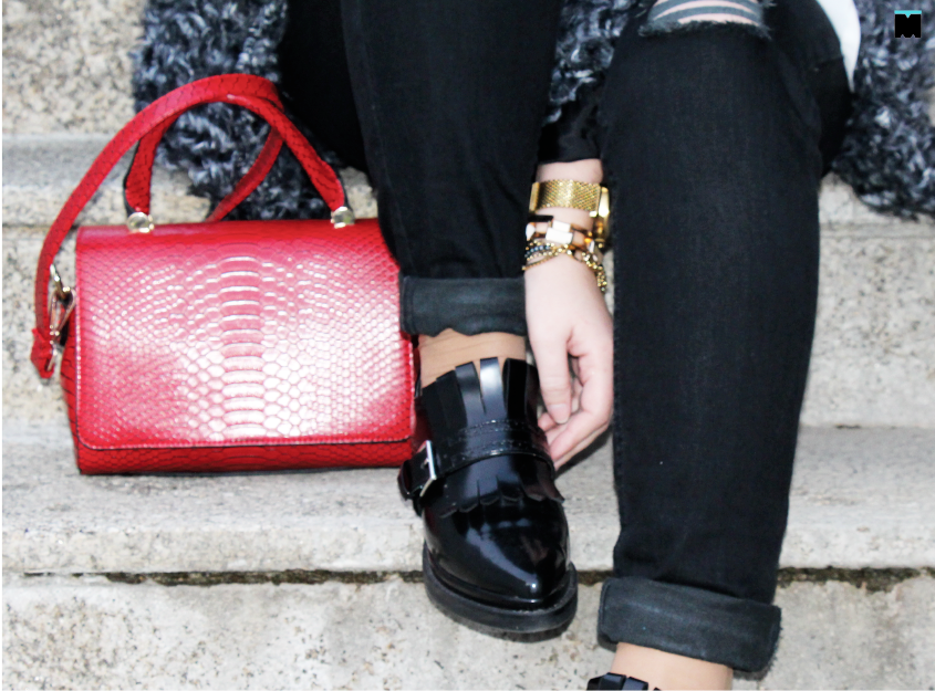 2. Compensar o volume com umas calças justas rasgadas (que contrasta com o ar arranjadinho do casaco e do calçado);