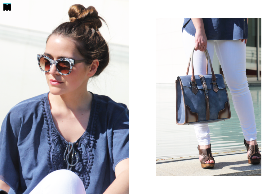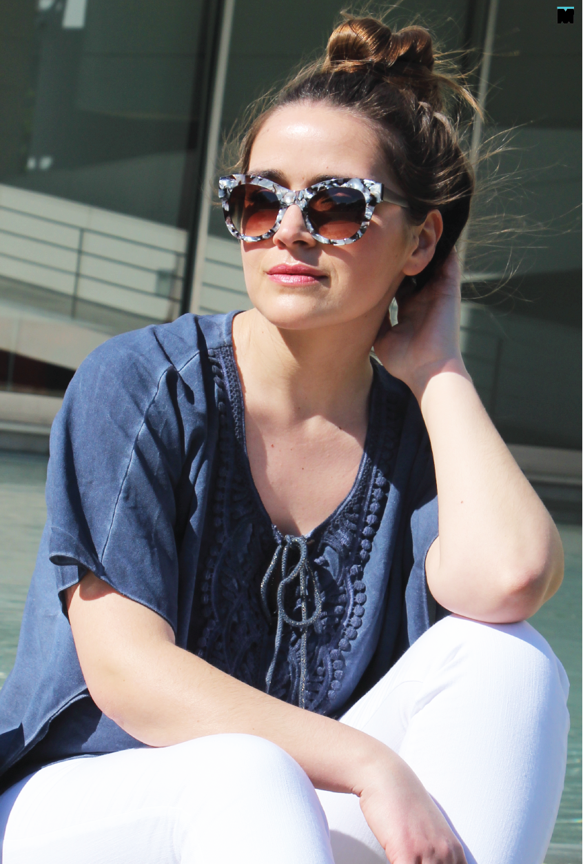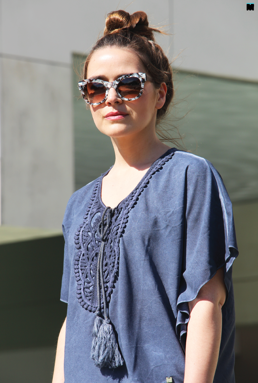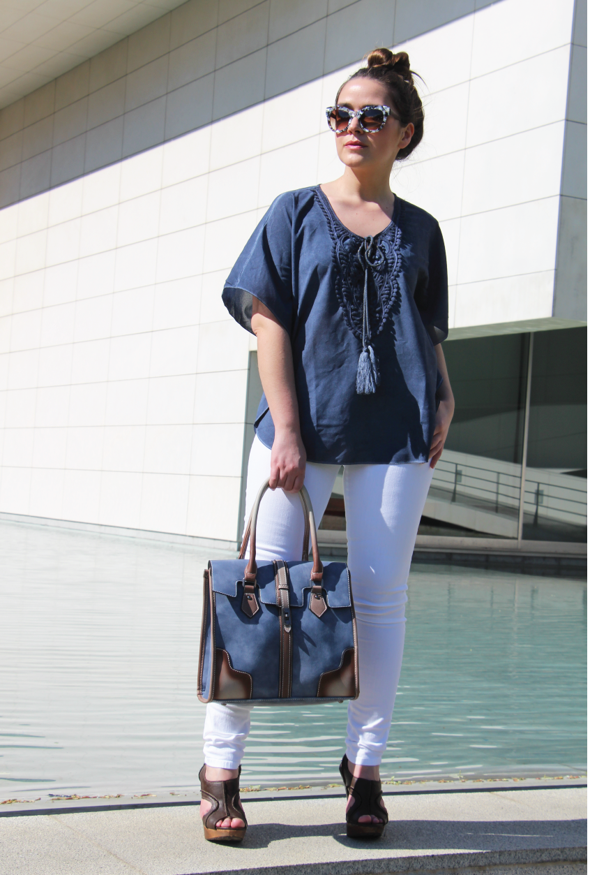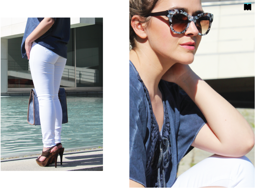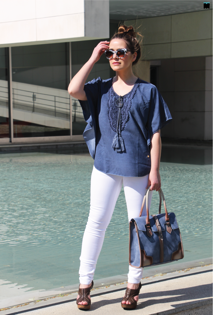 Tal como a minha irmã, não é um estilo que use e abuse, talvez por dois motivos. Primeiro. Algumas túnicas e vestidos são tão esvoaçantes que sinto que perco a forma no meio de tanto pano. Segundo. Pelo contrário, algumas mostram tanta pele e barriga que sinto-me desconfortável. Afinal, como usar este estilo de forma elegante? Tal como mostrámos durante a semana, o segredo é, sem dúvida, escolher peças fluídas, sim, mas de acordo com o nosso tipo de corpo e contrastar com outras mais clean e contemporâneas. Eu escolhi esta camisola da Marjocri, que mostrámos aqui, porque tem todos os elementos de um peça boho como aplicações, cordões e o aspecto envelhecido, sem ser demasiado fluída e comprida. Mesmo assim, para compensar a largura da peça, optei por umas calças super justas em sarja branca que não mostram ponta de celulite (incríveis mesmo!) e este é, talvez, um dos maiores truques para usar peças largas… Compensar, sempre, com a outra peça mais justa. Fica a dica!