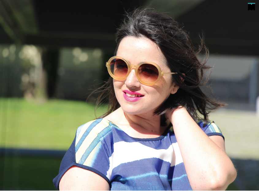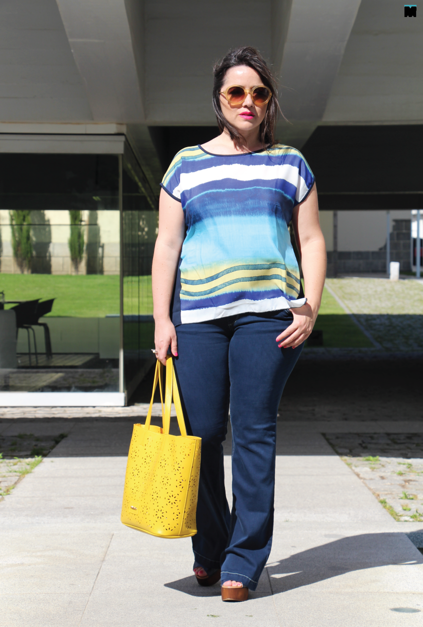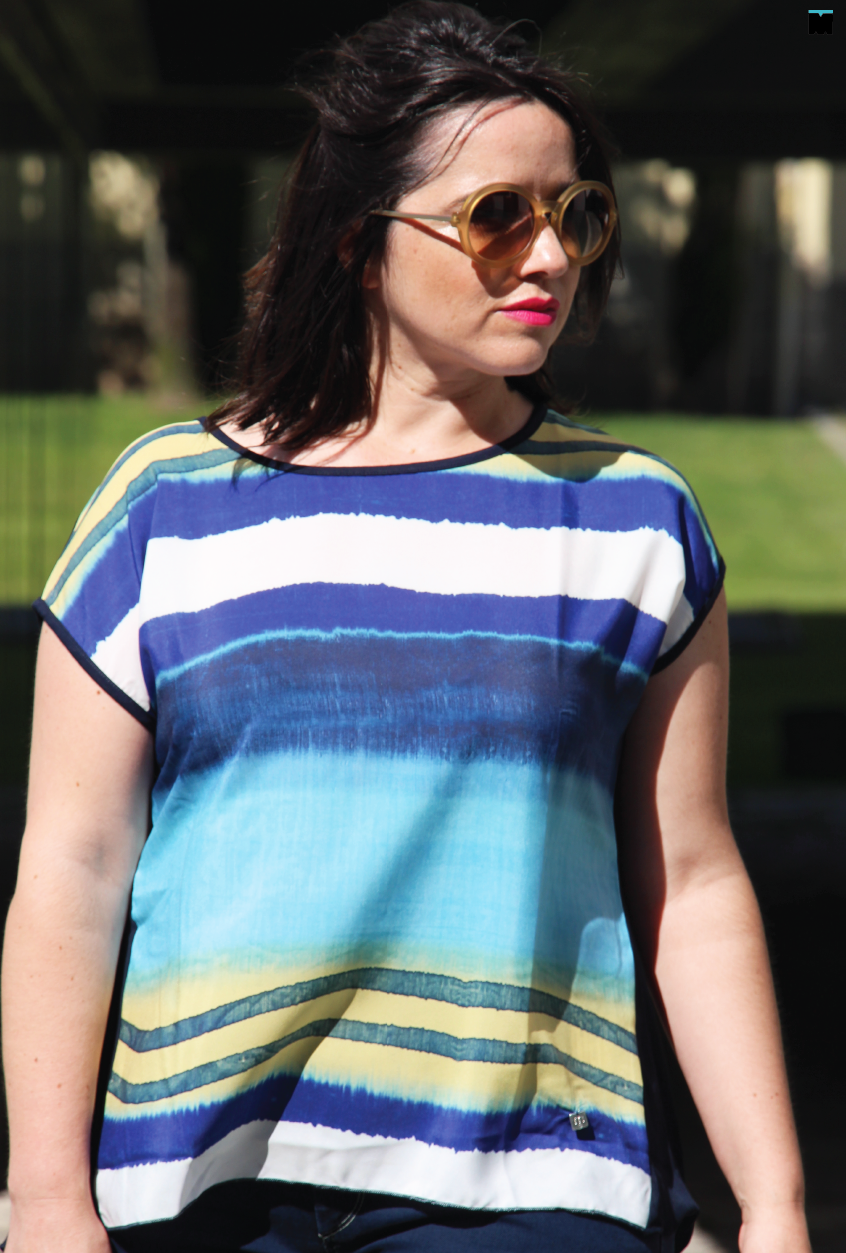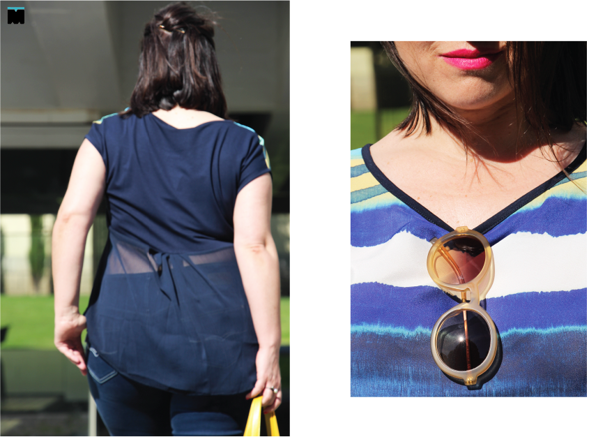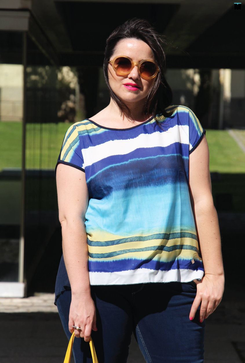 Para além disso, havendo ou não a dúvida, esta peça é excelente para tornar a silhueta mais esguia, porque não é completamente às riscas e a parte que é (a da frente), vai diminuindo, ligeiramente, à medida que o corpo vai alargando, fazendo dois triângulos laterais em azul escuro, que cortam visualmente um pouco da barriga e anca. É muito subtil, mas faz toda a diferença!