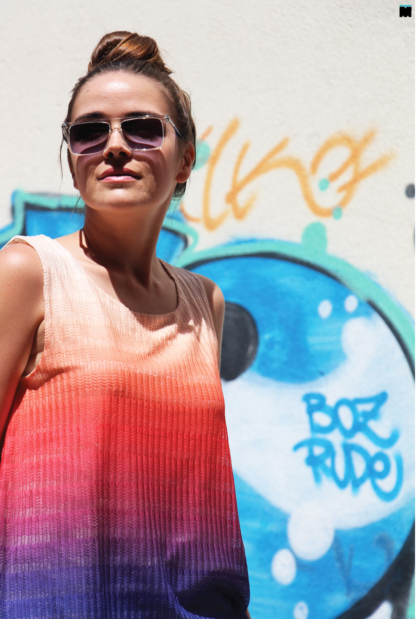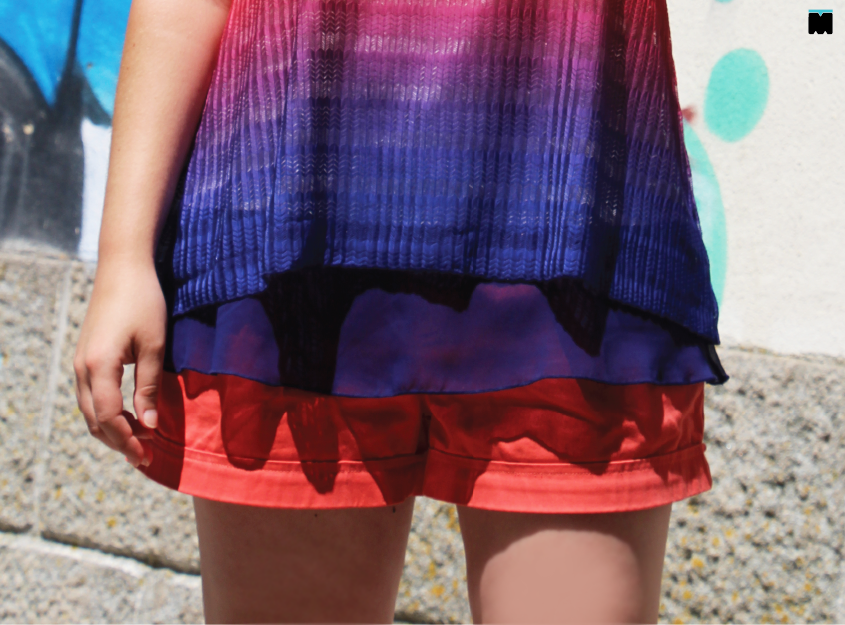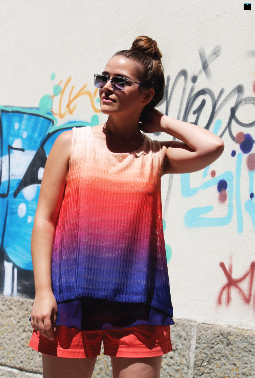O peach echo é das minhas cores favoritas para esta estação e até fiquei com a t-shirt que a minha irmã mostrou aqui (e que eu já mostrei aqui!). Adoro-a! Fiquei indecisa entre o menta que sugerimos ontem (ver aqui), mas vocês já sabem que eu prefiro cores quentes, não é? Uso-a imenso com ganga escura e branco ou branco pérola, mas na realidade esta cor combina com taaaantas outras, mas tantas outras, que decidi mostrar-vos como, trazendo o arco-íris, em forma de top, atrás de mim (ou em cima de mim…). Digam lá, se este top não é uma maravilha? Mais fácil, não há!