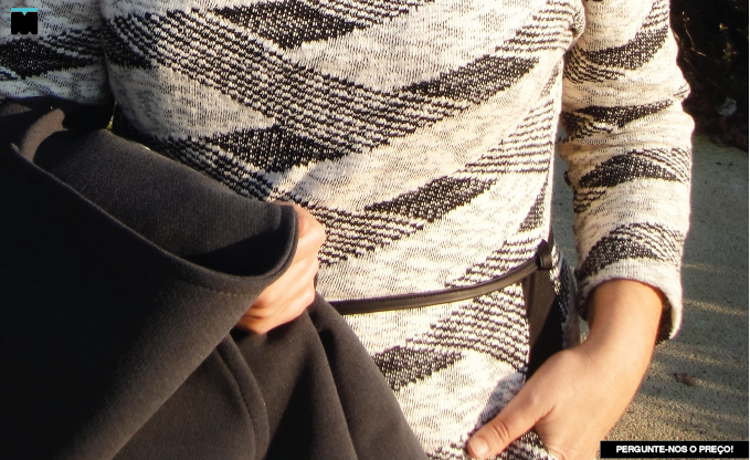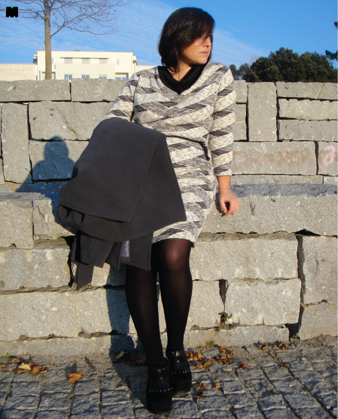 Sabem quando pegam numa peça de roupa e pensam... Hum, não! Pois é, este vestido da loja Manual da Moda que vos trago, hoje, foi um desses casos. Quanto mais o analisava mais achava que tinha tudo para não funcionar no meu corpo: a cor clara, o padrão muito largo, a malha... Enfim, nem lhe ia dar uma hipótese, mas pensei no conselho que tanto vos dou. É preciso experimentar! (Sou mesmo chata, não sou?) Então, lá empurrei o meu rabo gordo para o vestuário e saí de lá com um sorriso de orelha a orelha! Para vos mostrar o resultado, completei o visual, porque na rua faz um frio de rachar, com uma das maiores tendências para este ano, o casaco robe. Ora, aqui vai!