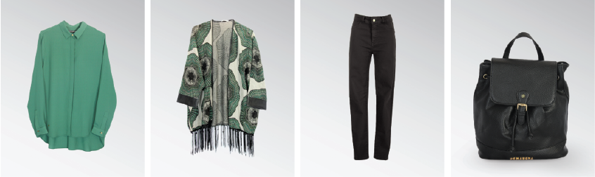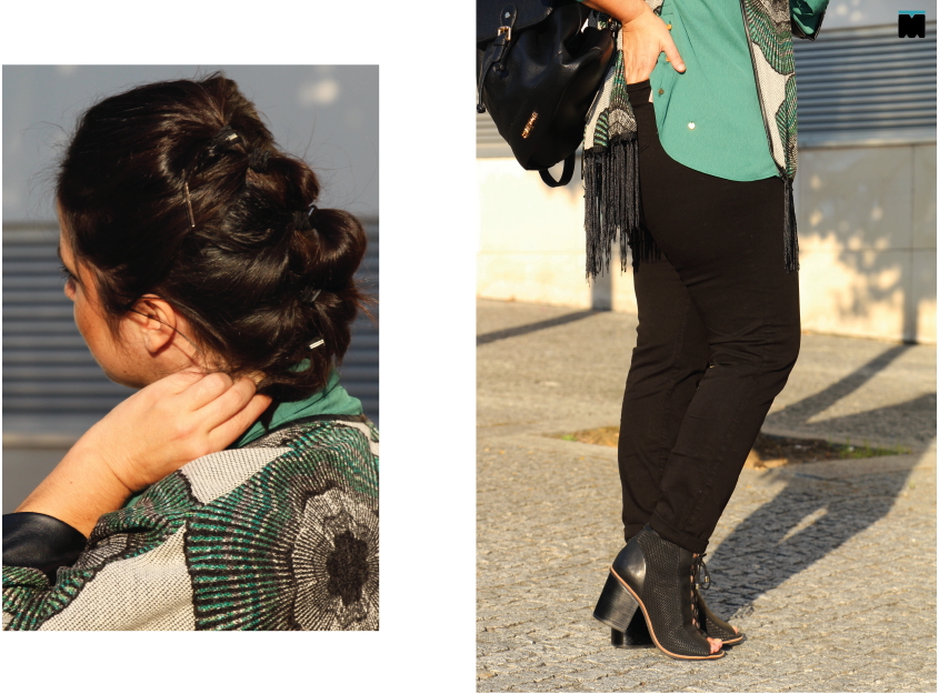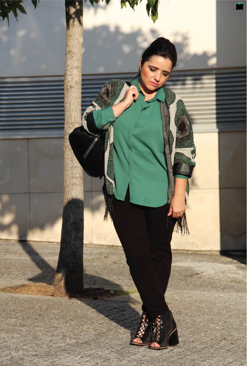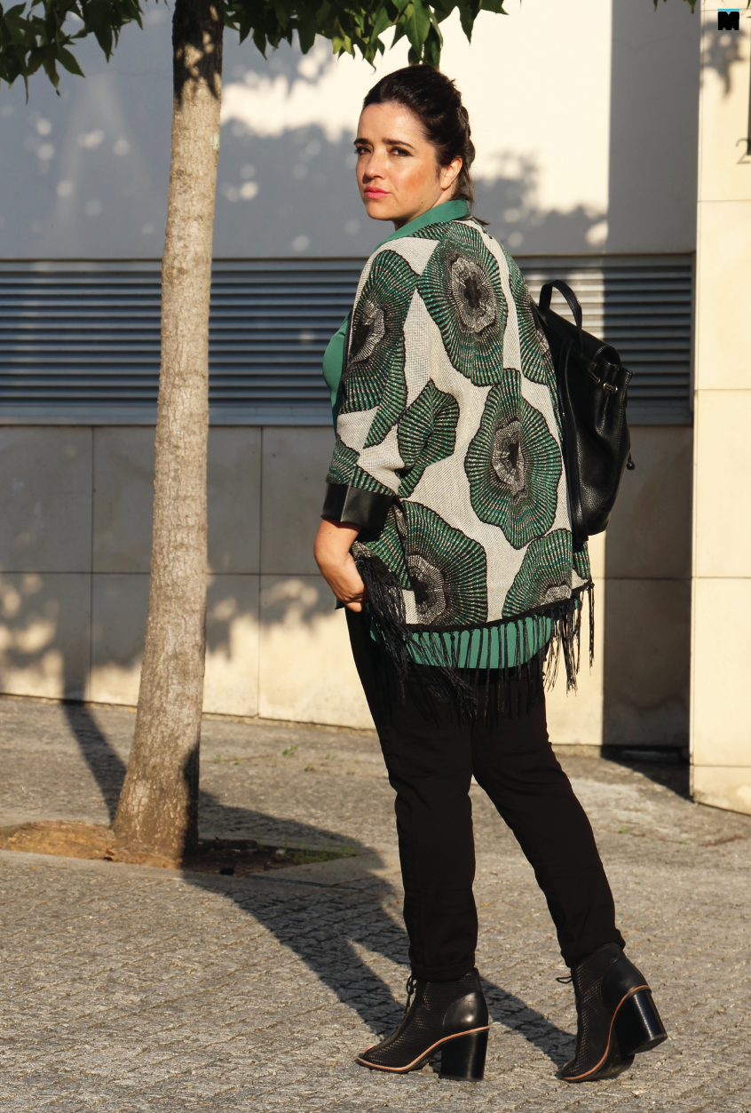 Se sofre do mesmo mal, o quimono pode ser a peça ideal para ultrapassar estas indecisões meteorológicas e este que vos trago hoje, disponível na loja online Manual da Moda até ao tam. 48, é uma excelente opção. Para além de ter a composição perfeita e duas das cores que mais gosto, preto e verde, tenho de admitir que o meu pormenor favorito, neste modelo, são os acabamentos em polipele. Não acham que dá logo outra textura ao visual?