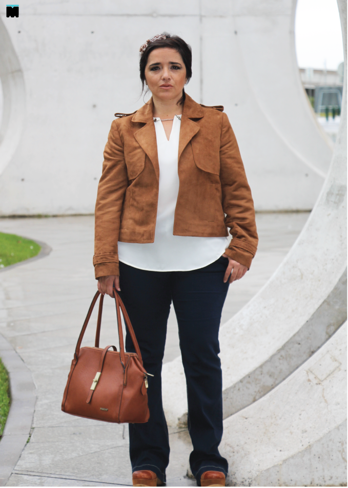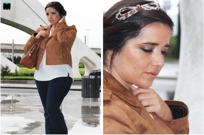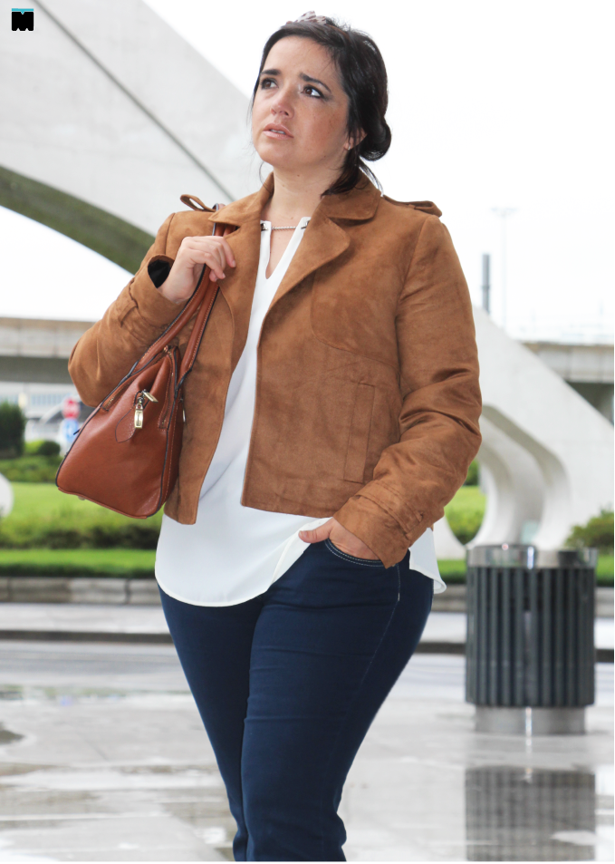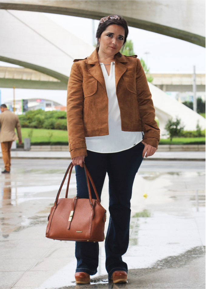 Quando escolhemos a camurça como tema da semana (ver aqui) sabíamos que inspirações não iam faltar, mas não é bem assim. Para a Carla talvez... Já eu, tive algumas dificuldades. É que a camurça é muito linda, mas não é fácil de vestir tamanhos grandes, porque não é elástica. Claro que, hoje em dia, existem imitações mais fáceis de adaptar e este casaco é um bom exemplo, porque funciona como terceira peça (veja o que é aqui). Talvez lembrem-se dele, porque a Carla já o usou aqui. Ela ficou tão linda que pensei em mostrar-vos que gordinha pode usar camurça, sim, e pode usá-la como uma magra! E mais... Pode usá-la com bocas de sino e camisa branca! Afinal de contas, aqui luta-se pela igualdade! Pela igualdade entre tamanhos, porque a moda pode e deve ser para todos as mulheres, independentemente, do seu número. Qual é o segredo? Na realidade, não somos nós que temos que ser perfeitas (seja lá o que isso for), mas sim as peças que escolhemos. Elas existem! É só procurar nos sítios certos!