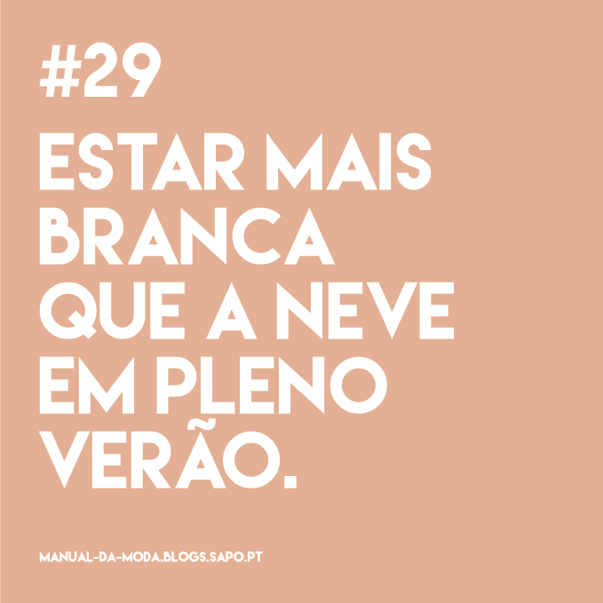 Achámos pertinente trazer este assunto à baila, uma vez que esta semana falámos da nova tendência que aposta numa grande variedade de tons nude, isto é, da cor da pele. Ora bem, o nosso tom de pele é tão claro, mas tão claro que até uma lula consegue meter-nos inveja. No outro dia, fomos à praia e percebemos que se não fosse a toalha e o biquíni, ninguém daria por nós, espraiadas na areia. E até gostaríamos de dizer que é exagero, mas não é! Não é.